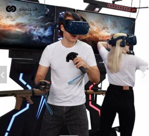 VR Team building games mt everestClimb the metaphorical Mountain to achieve business success!  This is a great virtual reality team building option because it immediately allows people to have an amazing experience that they can share with their co-workers- and help each other get to the perilous summit of Mt. Everest!  Is your team up for this group challenge to conquer the summit?   Virtual teams of 5, in-person min 12′ area.